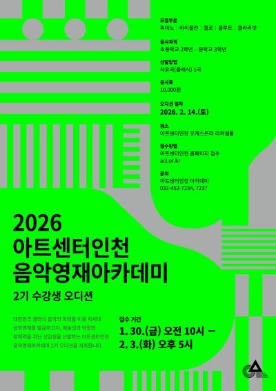 아트센터인천은 다음 달까지 음악영재 아카데미 2기 참가자를 모집한다. 신청서 접수는 2월 3일 오후 5시까지다. 분야는 피아노․바이올린․첼로․플루트․클라리넷, 대상은 초등학교 2학년부터 중학교 3학년까지다.