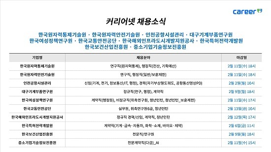 취업 포털 커리어가 한국원자력통제기술원, 한국원자력안전기술원, 인천공항시설관리, 대구기계부품연구원, 한국여성정책연구원, 한국교통안전공단, 한국해외인프라도시개발지원공사, 한국특허전략개발원, 한국보건산업진흥원, 중소기업기술정보진흥원 채용 소식을 30일 발표했다.