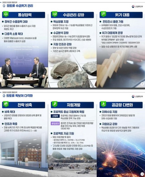 먼저 단기 수급위기 관리를 위해 다양한 채널을 통해 통상협력을 적극 확대하고, 희토류 17종 전체를 핵심광물로 지정하며, 희토류 수출입코드(HSK코드) 신설·세분화 등을 통해 수급분석을 강화하기로 했다.