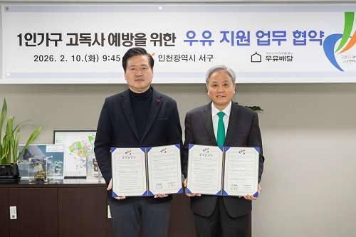 인천 서구(구청장 강범석)는 지난 10일 (사)어르신의안부를묻는우유배달(이사장 호용한)과 함께 독거노인 가구 고독사 예방과 지역사회 복지 안전망 강화를 위한 업무협약(MOU)을 체결했다.
