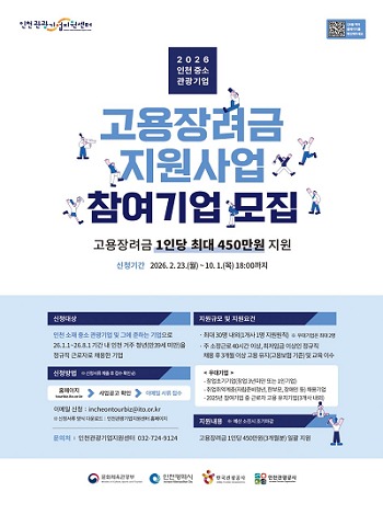 인천시와 인천관광공사는 지역 중․소 관광기업의 안정적인 인력 운영을 지원하고 인천 거주 청년의 지속 가능한 일자리 창출을 위해 ‘인천 중․소 관광기업 고용장려금 지원사업’을 추진한다고 밝혔다.