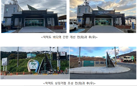 진리항 선착장 게이트 정비, 덕적도바다역 간판 개선, 상징 거점 조성 등을 통해 통합브랜드를 입혔으며, 노후화된 시설을 정비하면서도 기존 구조를 유지하고 브랜드 색채와 워드마크를 적용해 섬의 첫인상을 바꿨다.