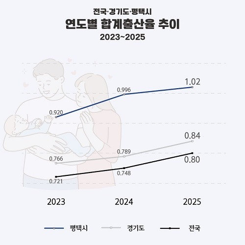 국가데이터처가 발표한 2025년 잠정 합계출산율에 따르면 평택시는 2024년 0.996에서 2025년 1.02로 상승하며 다시 1.0명을 넘어섰다. 2023년(0.92) 이후 2년 연속 상승이다.
