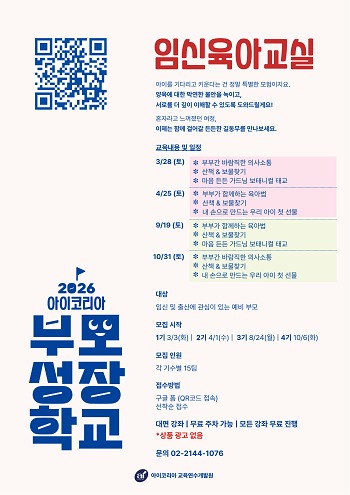 아이코리아 김태련 이사장은 “임신과 출산을 앞둔 예비 부모가 올바른 정보와 긍정적인 경험을 통해 부모로서의 첫걸음을 안정적으로 내디딜 수 있도록 돕는 것이 본 프로그램의 취지”라며 “앞으로도 부모의 성장을 지원하는 공익적 교육을 지속적으로 확대해 나가겠다”고 밝혔다.