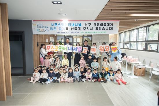 이영락 ㈜포스코인터내셔널 인천발전소장은 “지역사회와 함께 성장하는 기업으로서 아동들에게 건강한 보육환경 조성에 기여할 수 있어 기쁘다”며 “앞으로도 다양한 사회공헌 활동을 통해 지역사회와 상생하겠다”고 밝혔다.