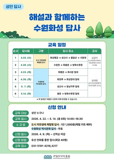 전화(031-5191-4216)로 신청할 수 있다. 선착순 모집이다. 도시 자연생태 체험형 답사 비용은 1000원, 수원화성 역사문화 답사는 무료다.