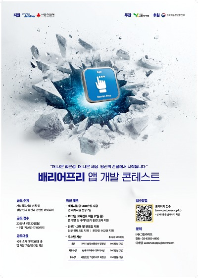 아이디어 모집은 5월 17일(일)까지며, 앱 개발이 가능한 대학(원)생 3인 1팀으로 구성해 배리어프리 앱 개발 콘테스트 홈페이지에서 지원 가능하다. 자세한 내용은 홈페이지(www.autoeverapp.kr)에서 확인할 수 있다.