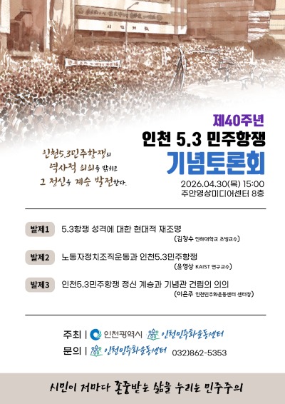 인천시와 인천민주화운동센터는 2026년 4월 30일(목) 오후 3시 주안영상미디어센터 8층에서 ‘제40주년 인천5.3민주항쟁 기념토론회’를 개최한다고 27일 밝혔다.