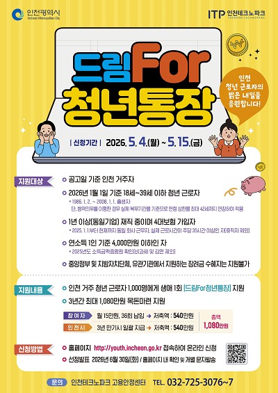 인천시는 청년들이 안정적으로 미래를 설계하고 목돈을 마련할 수 있도록 지원하는 ‘드림For청년통장’ 사업 참여자를 오는 5월 4일부터 15일까지 모집한다고 밝혔다.