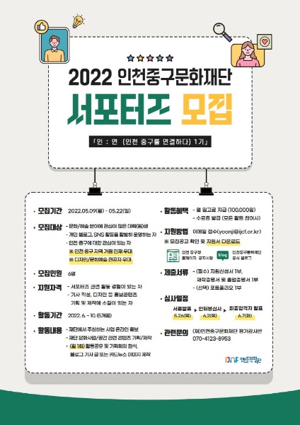 인천 중구 지역과 문화·예술 분야에 관심이 많은 대학(원)생, 블로그, SNS 등 온라인 콘텐츠 제작 경험이 있는 청년 누구나 서포터즈 모집에 지원이 가능하며, 기사 작성과 카드뉴스 제작 총 2개 부문으로 나누어 총 6명의 서포터즈를 선발할 계획이다.