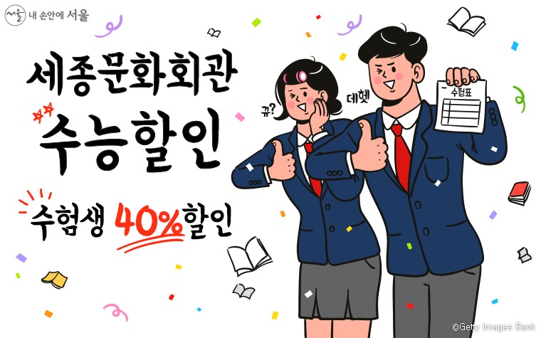 수능이 끝난 11월 17일부터 12월 말까지 세종문화회관에서 열리는 연극, 뮤지컬, 무용, 합창, 국악까지 다양한 분야의 공연을 40% 할인하여 관람할 수 있도록 한다.