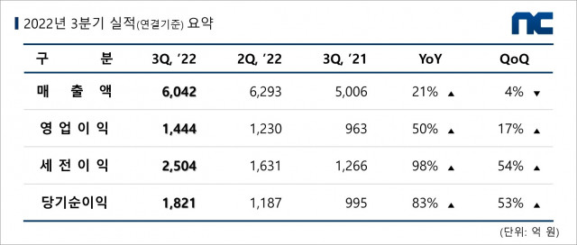 연결기준 매출 6042억원, 영업이익 1444억원, 당기순이익 1821억원리니지W, 길드워2 등 글로벌 IP로 견조한 실적 달성… 마케팅비 효율화로 영업비용 감소전년 동기 대비 북미·유럽 62%, 아시아 48% 매출 성장, 해외 및 로열티 매출 비중 38%