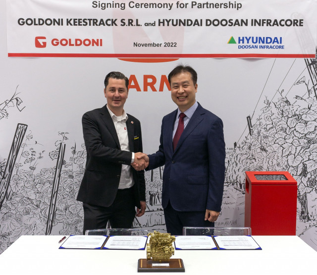 현대두산인프라코어는 11월 9~13일 5일간 이탈리아 볼로냐에서 개최된 유럽 3대 농기계 전시회 ‘2022 에이마’(EIMA international 2022)에 참가, 이탈리아 골도니 키스트랙(Goldoni Keestrack, 이하 골도니)사와 8000대 규모의 엔진 공급 합의서에 서명했다고 밝혔다.