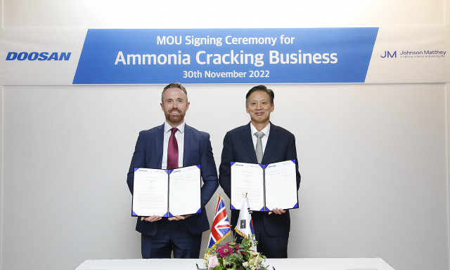 두산에너빌리티는 영국 암모니아 크래킹 솔루션 업체 존슨 매티(Johnson Matthey, 이하 JM)*와 ‘암모니아 크래킹 사업 협력을 위한 업무협약(MOU)’을 체결했다. 경남 창원 두산에너빌리티 본사에서 열린 협약식에는 두산에너빌리티 이광열 TM(Turbo-machinery) BU장, JM 사이먼 스탠브리지(Simon Stanbridge) 사업개발 담당 등 각 사 관계자들이 참석했다.