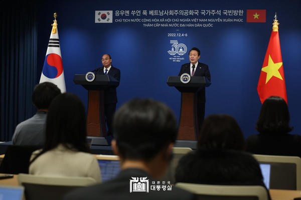 윤 대통령은 이날 오후 서울 용산 대통령실에서 한국을 방문한 응우옌 쑤언 푹 베트남 국가주석과 정상회담을 마친 뒤 공동언론발표문을 통해 이같이 말했다.