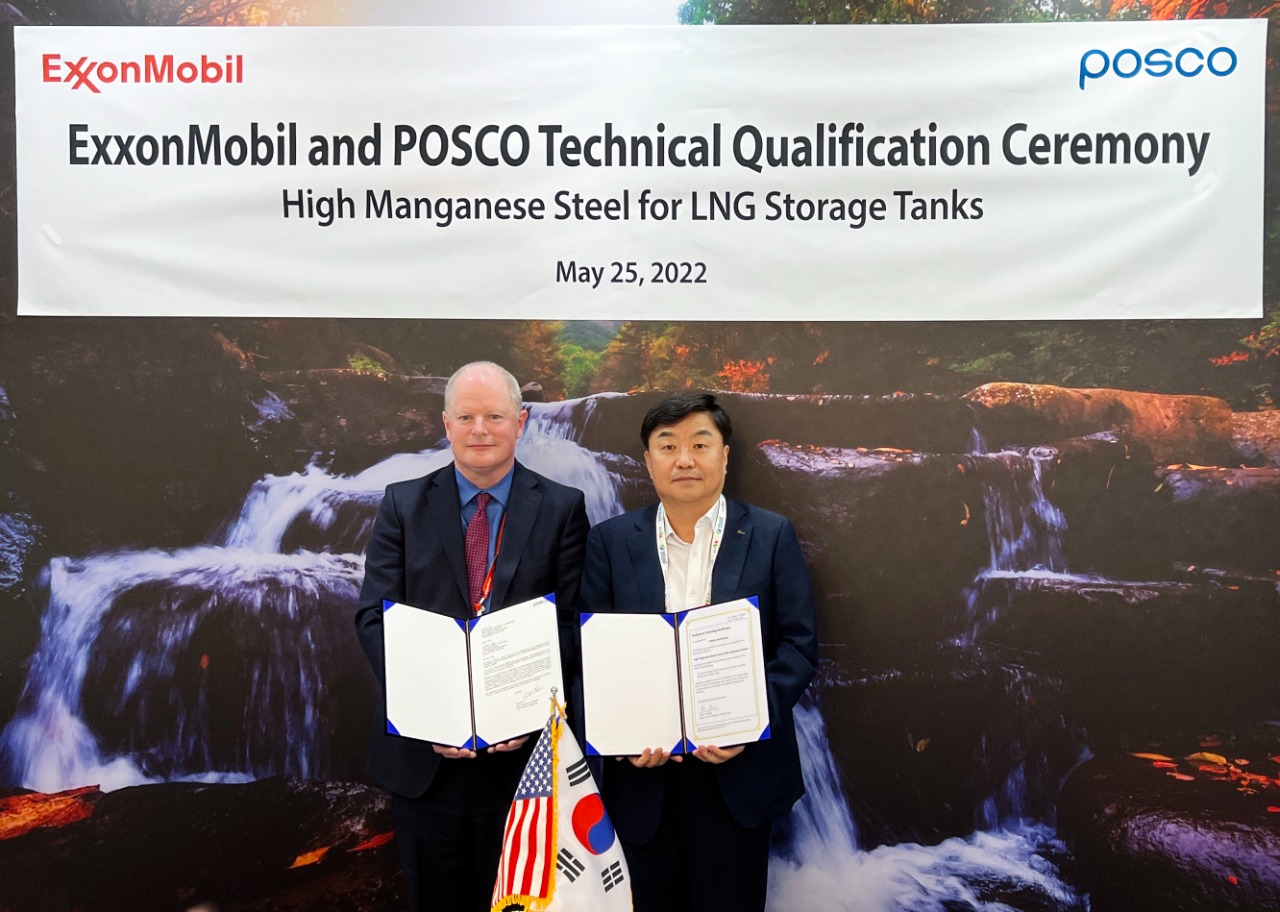 포스코와 엑손모빌은 25일 대구에서 개최된 WGC2022 행사장에서 만나 극저온용 고망간강의 기술승인서 전달식을 가졌다. 행사에는 포스코 주세돈 기술연구원장, 엑손모빌 피터 클라크 (Peter Clarke) 수석부사장 등이 참석했다.