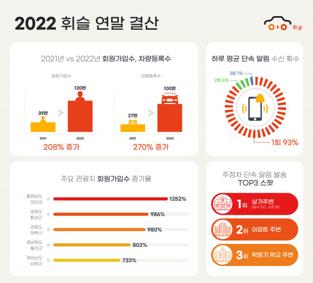 스마트한 운전자를 위한 지역 통합 주정차 단속 사전 알림 앱 ‘휘슬(Whistle)’이 2022년 서비스 이용 데이터를 담은 연말 결산을 발표했다. 휘슬은 헥토그룹과 회사 관계사로 편입된 아이엠씨티가 공동으로 개발한 서비스 브랜드다.