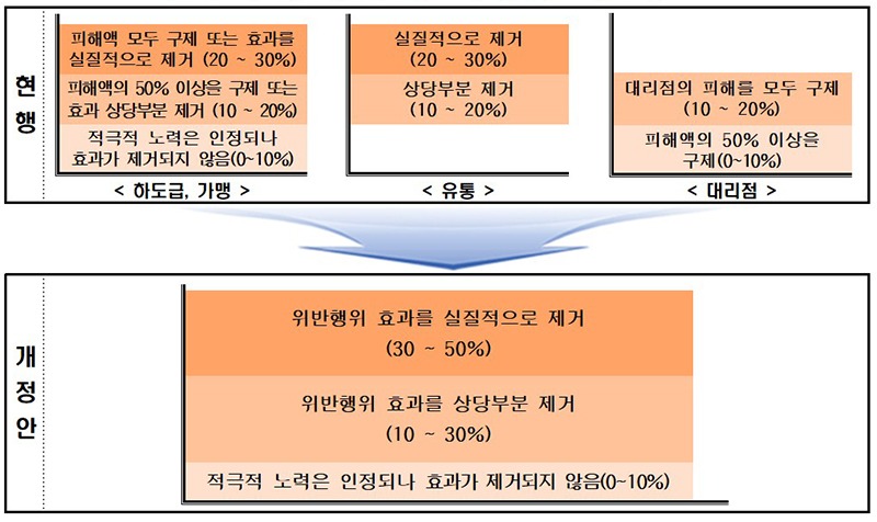 이에 기존에는 자진 시정 시 최대 30%(대리점 분야는 최대 20%) 과징금 감경이 가능했으나, 앞으로는 그 비율이 최대 50%로 확대된다.