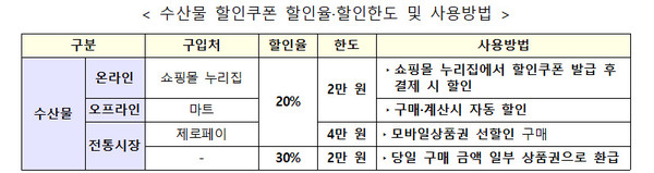 해수부는 1인당 2만 원 한도로 20% 할인을 지원한다. 참여 업체의 자체 할인을 추가해 소비자들은 최대 60%까지 할인된 가격에 수산물을 구매할 수 있다.
