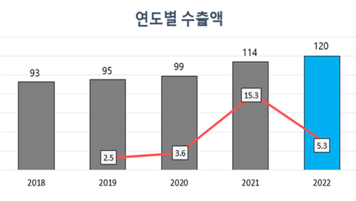 농림축산식품부와 해양수산부는 2022년 농수산식품 수출액(잠정)이 전년 대비 5.3% 증가한 120억 달러로 역대 최고치를 경신했다고 3일 밝혔다.