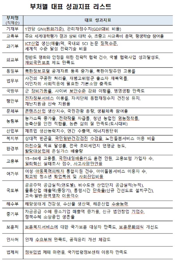 일례로 기재부는 ‘1인당 GNI(원화 기준)’와 ‘관리재정수지(GDP 대비 비율)’을, 복지부는 ‘상대적 빈곤율’, ‘국민일반건강검진 수검률’, ‘노인돌봄서비스 이용 비율’을 공개하는 식이다.