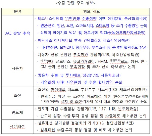 먼저 수출은 글로벌 수요부진, 반도체 가격 하락 등으로 1월 수출 상황이 어려운 가운데, UAE 순방성과를 수출확대 및 다변화 기회로 적극 활용하기 위한 행보를 강화한다.