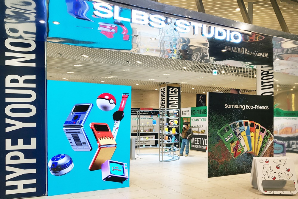 팝업스토어 ‘SLBS 스튜디오 ‘ 는 매거진의 한 면을 펼친 것처럼 미래지향적인 분위기로 연출됐다 .
