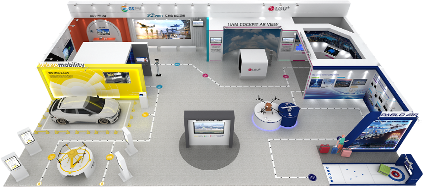 전시관은 ▲컨소시엄 공동관을 비롯해 ▲LG유플러스의 UAM 교통관리 플랫폼 ▲카카오모빌리티의 멀티모달(Multi-Modal) 모빌리티 비전 ▲GS건설의 친환경·모듈러·스마트 버티포트(Vertiport, 수직 이착륙 비행장) 비전 ▲파블로항공의 UAM 통합운항관제시스템 및 드론배송 솔루션을 경험할 수 있는 5가지 공간으로 구성된다.