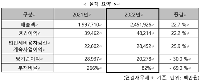 실적 개선에 따라 법인세 비용이 증가하고, 이연법인세 자산의 평가가 감액되면서 당기순이익은 전년도 289억 원에서 203억 원으로 30% 감소했다. 부채비율도 크게 줄었다. 2021년 말 기준 266%였던 부채비율은 22년 말 82%로, 전년대비 1/3 이하로 떨어졌다.