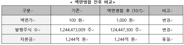 대한전선은 10대 1의 비율로 액면병합을 진행한다. 병합이 완료되면 보통주 액면가액은 현재 100원에서 1,000원으로 높아지고, 발행주식 총 수는 약 12억 4천만 주에서 1억 2천 4백만 주로 줄어든다. 자본금은 1,244억 원으로 병합 전과 동일하다.