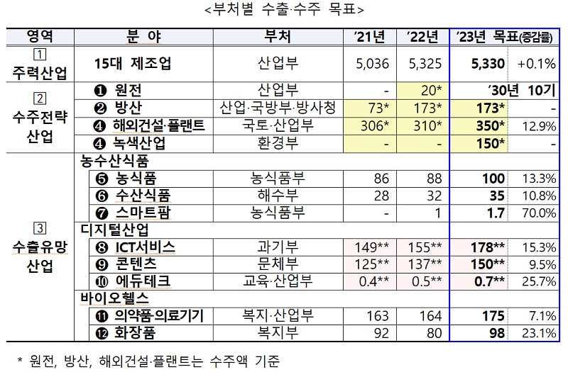 산업부는 15대 제조업을 통해 올해 5330억 달러, 2030년까지 10기의 원전 수출 목표를 세웠다. 방산은 산업부·국방부·방사청을 중심으로 173억달러를 수출한다는 계획이다.