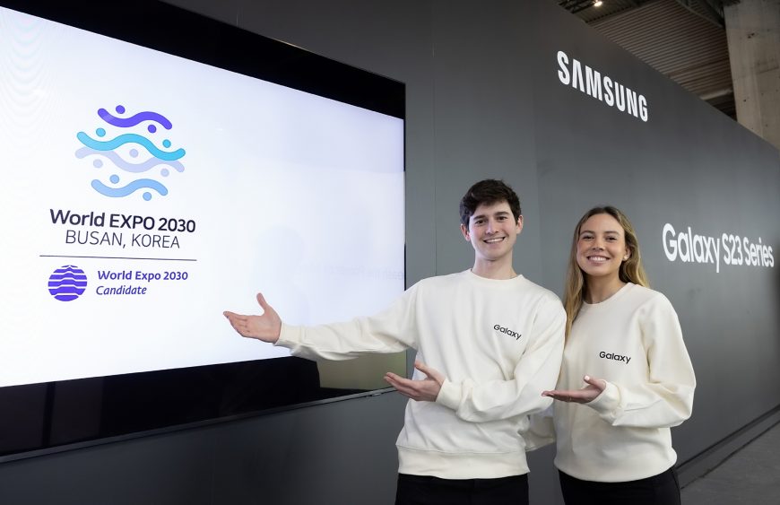 삼성전자가 2 월 27 일부터 3 월 2 일까지 스페인 바르셀로나에서 열리는 ‘ 모바일 월드 콩그레스 (MWC) 2023’ 에서 ‘2030 부산세계박람회 ( 엑스포 )’ 유치 활동을 알리고 있다 .