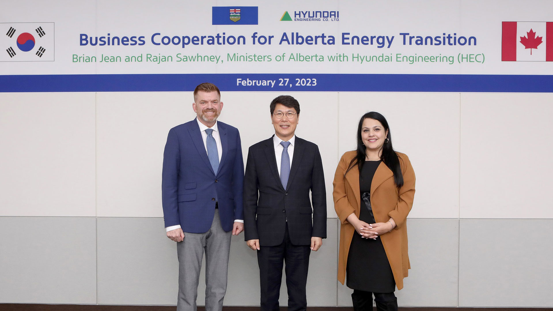 지난 27일(월), 홍현성 현대엔지니어링 대표이사 등은 현대엔지니어링 본사를 방문한 캐나다 알버타주 브라이언 진(Brian Jean) 고용·경제·북방개발부 장관 및 라잔 소니(Rajan Sawhney) 무역·이민·다문화부 장관 일행을 맞이하고, 알버타주의 ‘Zero Emission(무배출시스템)’ 목표 달성 방안에 대해 논의했다.