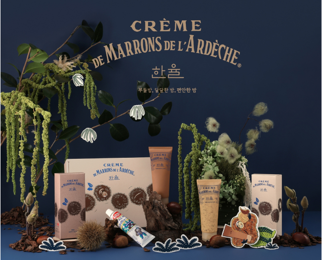 충남 부여산 무농약 밤 껍질을 넣어 만든 한율 대표 모공팩 ‘부들밤’ 라인과 프랑스 남부 리옹 지역의 야생밤을 원료로 하는 밤잼 브랜드 ‘크렘드마롱’이 밤 본연의 건강함으로 일상 속 휴식을 지향한다는 공통 가치로 함께했다.