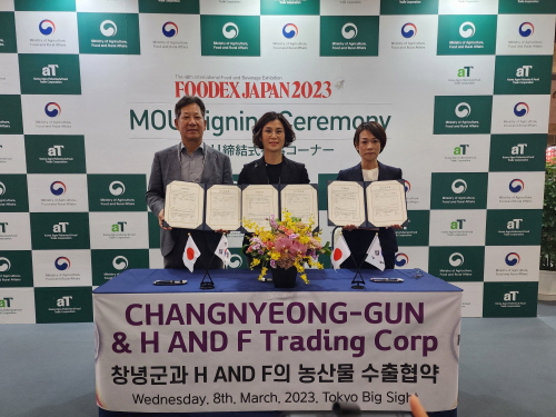 경남 창녕군은 지난 8일, 일본 도쿄에서 개최되는 '동경 식품 박람회(FOODEX 2023)'에 참가해 신선 농산물 200만 달러(한화 약 26억 원)를 수출하는 업무협약(MOU)을 체결했다.