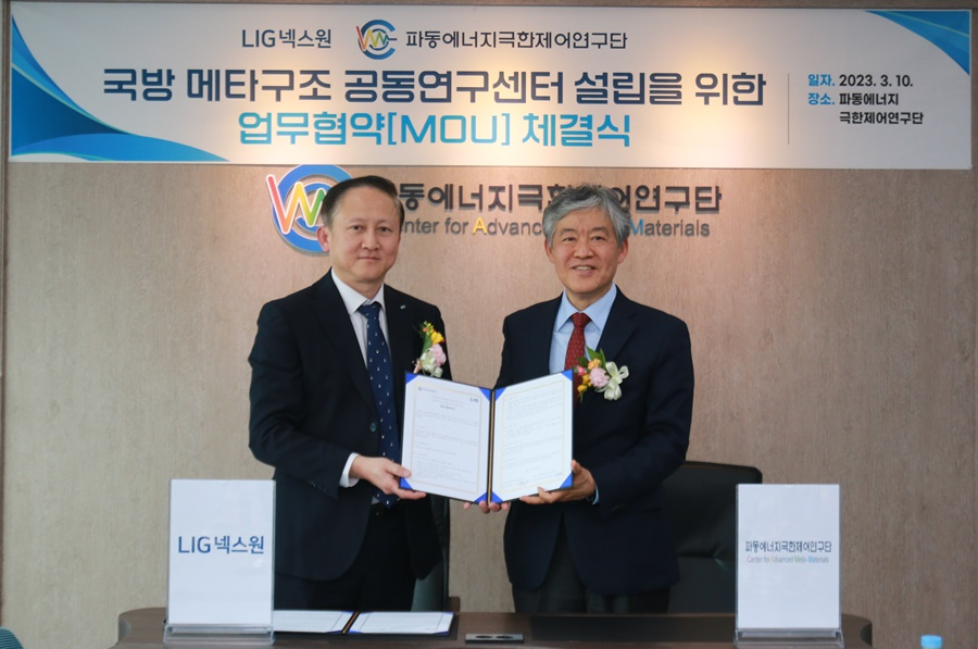 LIG 넥스원은 지난 10 일 대전 유성구에 위치한 파동에너지극한제어연구단에서 김건영 LIG 넥스원 C4ISTAR 연구개발 1 본부장 , 정문섭 C4ISTAR 사업부문연구위원 , 유구현 C4ISTAR 기계융합연구소장과 이학주 파동에너지극한제어연구단장 , 최태인 연구위원 등 주요 관계자들이 참석한 가운데 ‘ 국방 메타구조 공동연구센터 설립을 위한 업무협약 (MOU)’ 을 체결했다고 밝혔다 .