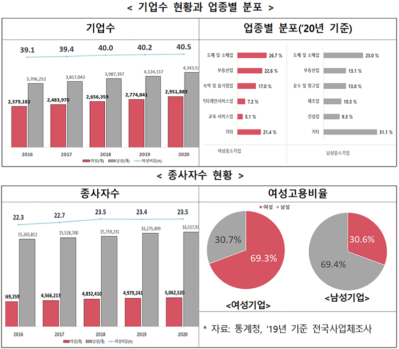 여성기업의 종사자 수는 506만 명으로 전체 종사자의 23.5%를 차지했으며 여성기업은 여성 고용 비율이 69.3%로 남성기업 여성고용 30.6%의 2.3배 수준으로 확인됐다.
