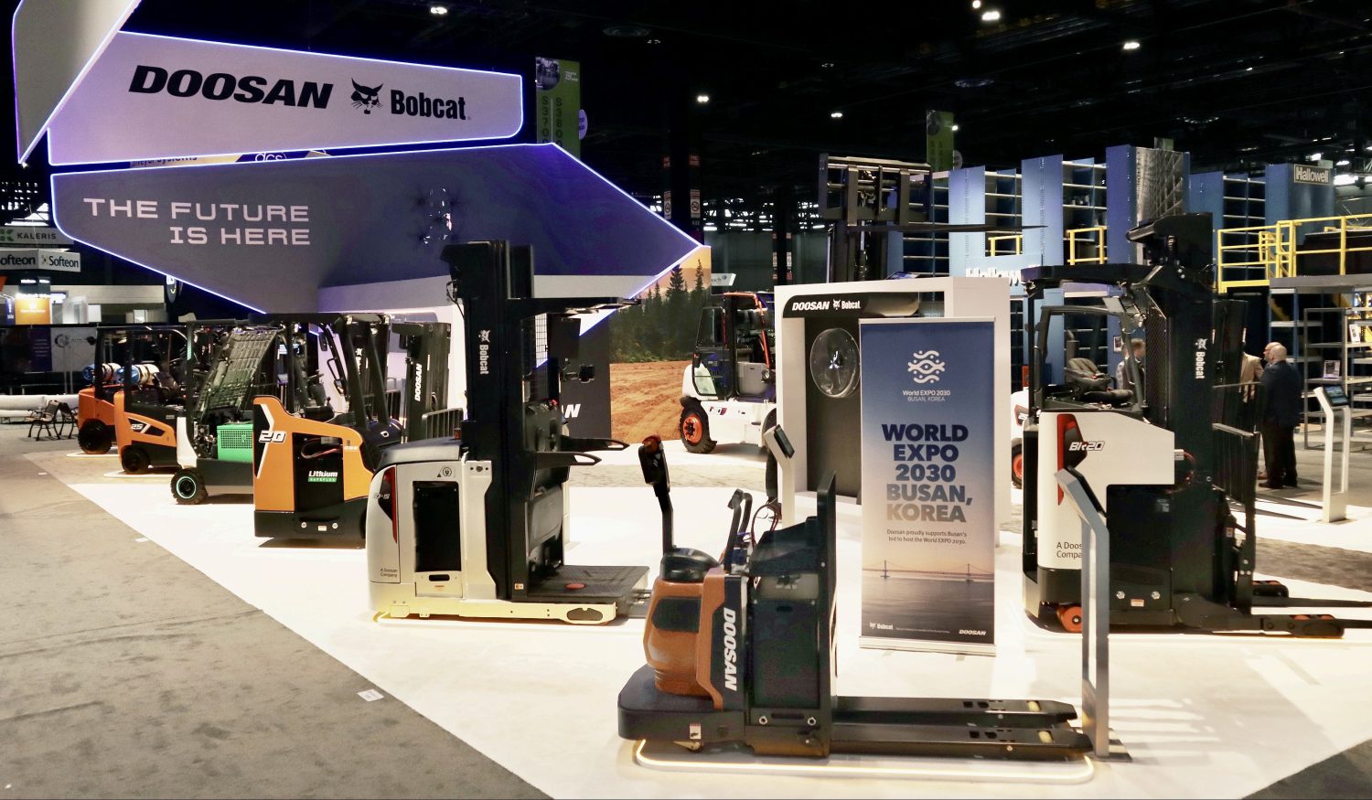 전시장에 자리한 9개 제품 중 5개는 ‘밥캣 지게차’로, 전시장에는 ‘두산’과 ‘밥캣’ 두 로고가 나란히 걸렸다. 밥캣 브랜드가 건설이나 농업용 장비가 아닌, 물류 장비 전시회에 등장한 것은 이번이 처음이다.