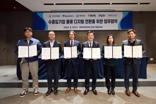 한국무역협회(KITA)는 12일 삼성동 트레이드타워에서 물류 디지털 기업 5개사(밸류링크유, 케이로지, 씨에어허브, 셀러노트, 컨가드)와 수출입기업 물류 디지털 전환 촉진을 위한 업무협약(MOU)을 체결했다.